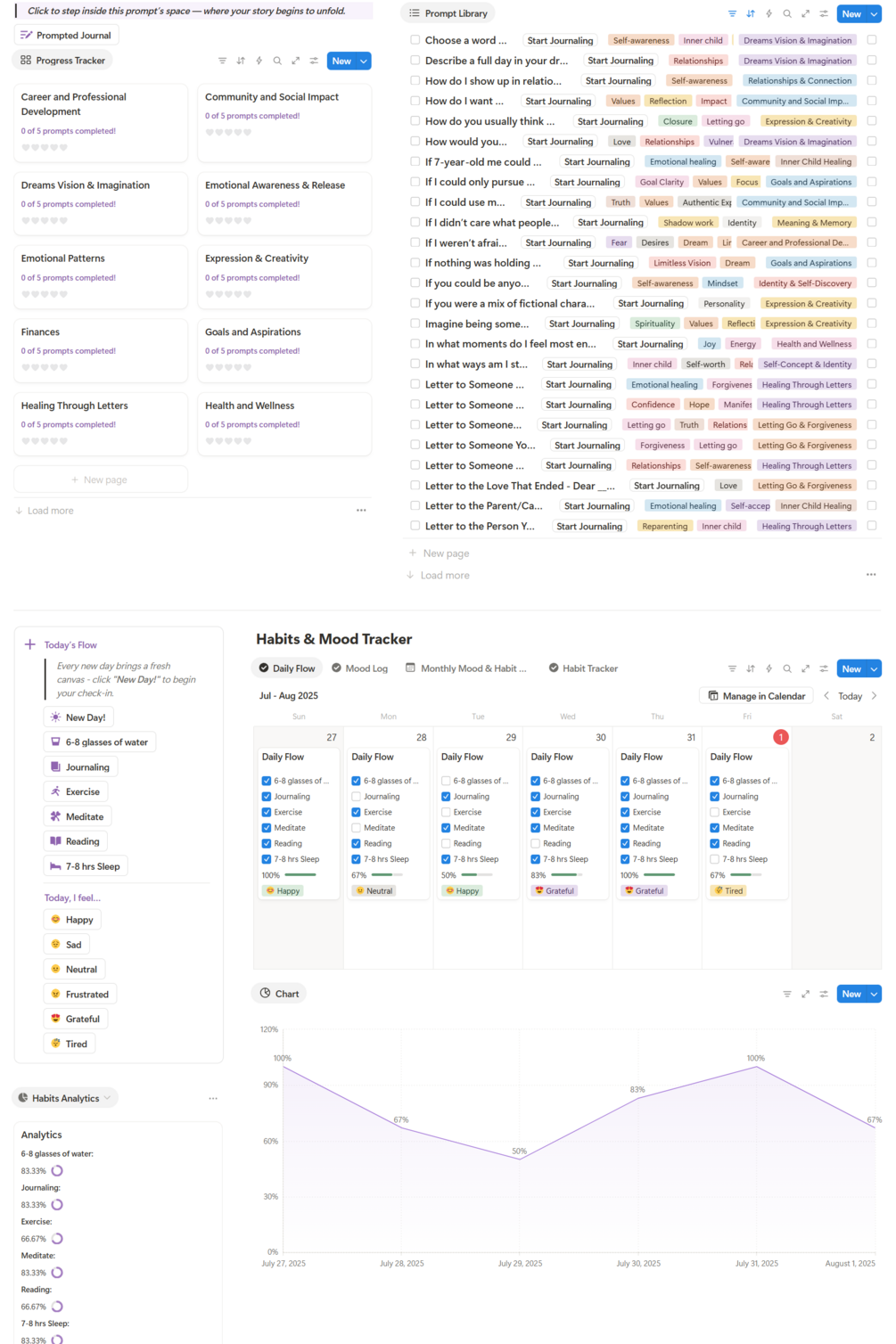 Whether it's a quick check-in, a heartfelt “Letter To…”, or a raw “Dear Diary” moment — this template gives you multiple journaling formats with beautiful built-in prompts. Daily, weekly, monthly reflections? All set up, just one button away.