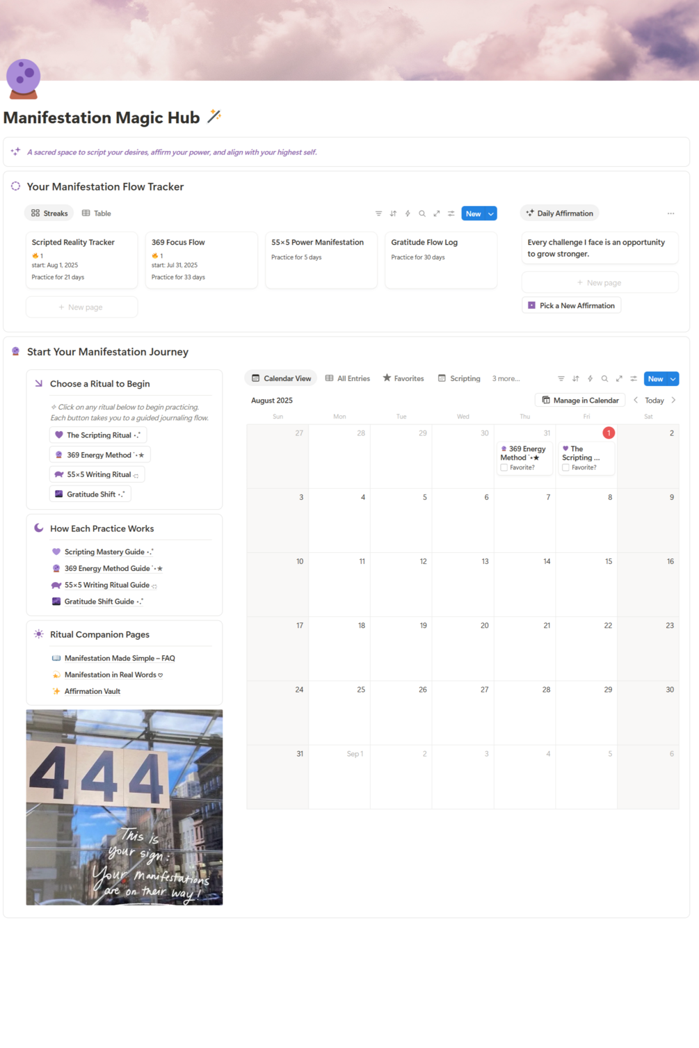 Imagine waking up, opening a calm, spacious Notion page, and being gently invited to journal your thoughts, track your energy, reflect on your growth, and realign with the version of you that you're becoming.