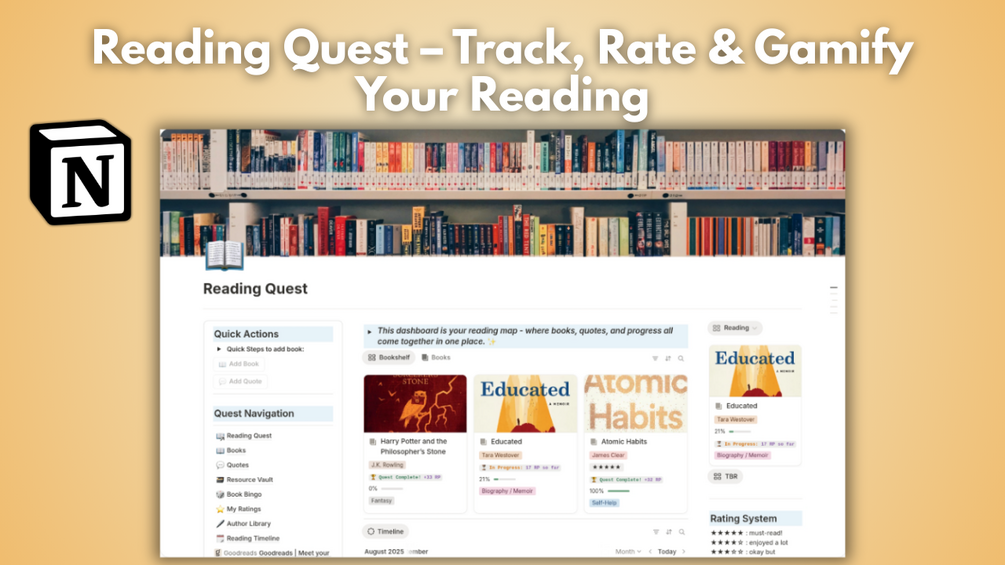 Reading Quest is a gamified Notion template that transforms your reading habit into an adventure. Instead of just logging titles, you’ll: