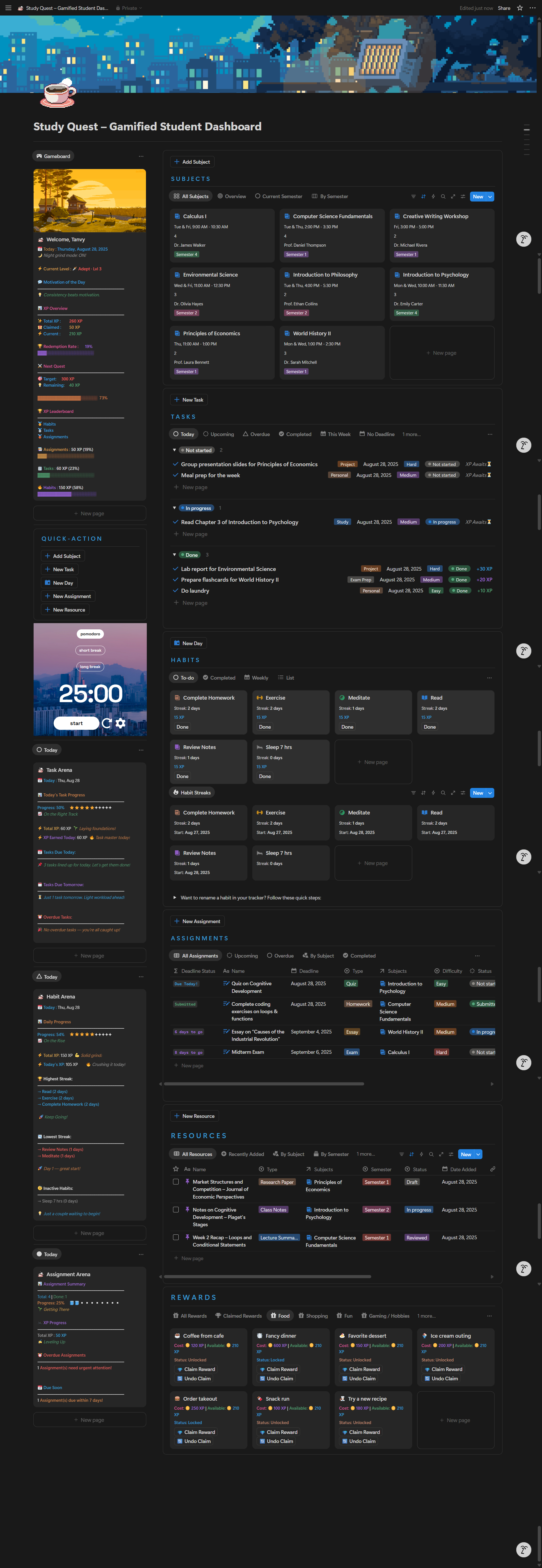 🎯 Turn studying into a game! Track subjects, tasks, and habits while earning XP and rewards with this gamified Notion dashboard.